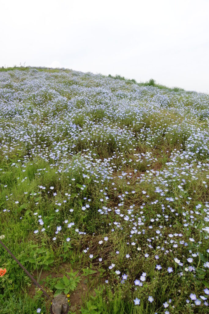 特に有名なのは“みはらしの丘”のネモフィラとコキア。 青い花で丘が染まる春、真っ赤に色づく秋は、全国から観光客が訪れるほどの人気だそうで、今回の目的はネモフィラです。