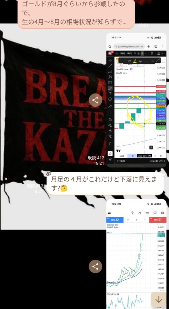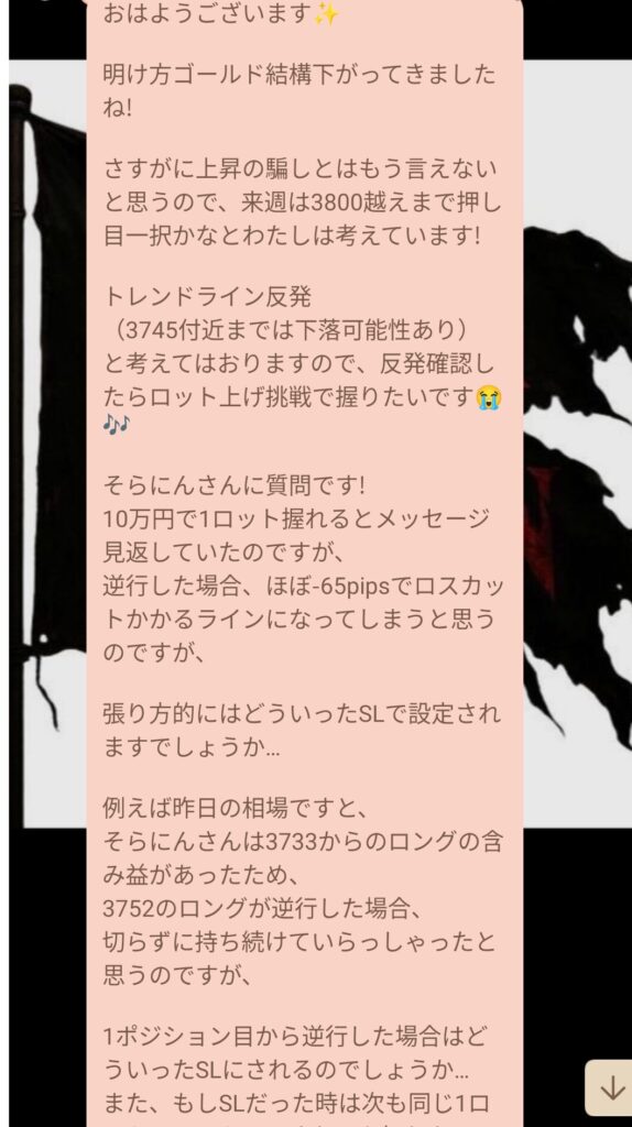 メンバーは、金曜から土曜の朝にかけて下がっていた相場を見て「来週は3800を超えて終わると思う」と話し、3745付近までの下落を見て反発したらロットを上げて挑戦したいと言っていた。そして質問が来た。