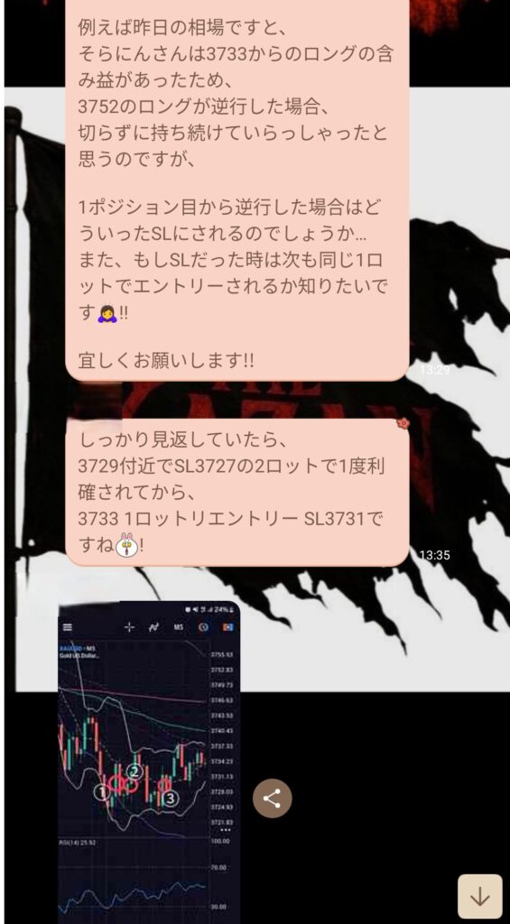 「金曜日の相場で、そらにんさんは3733からロングを持っていて含み益があったので、3752のロングが逆行しても切らずに持っていたと思うのですが、もし1つ目のポジションから逆行した場合、どこにSLを置いているのでしょうか? また、SLになった時は次も同じ1ロットで入るのでしょうか?」