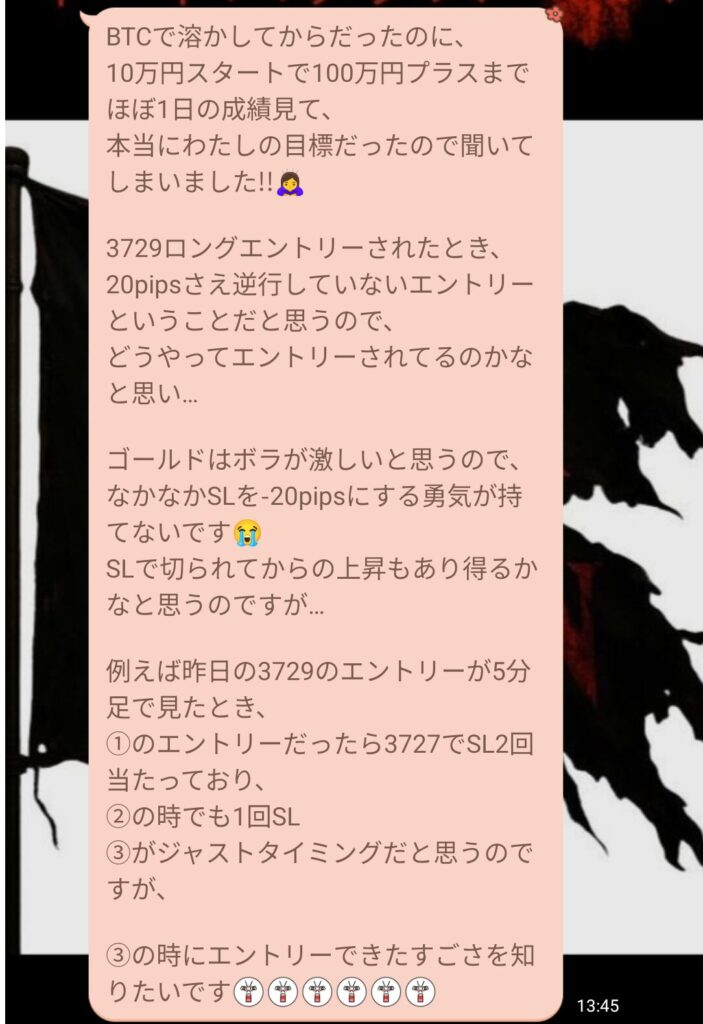 この方は、私がビットコインで大損して、次の日に10万円から再スタートして100万円までほぼ1日で達成したのを見て、自分の目標をを重ねてくれていた。