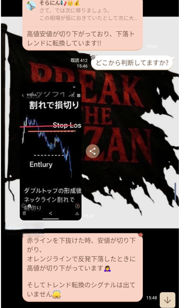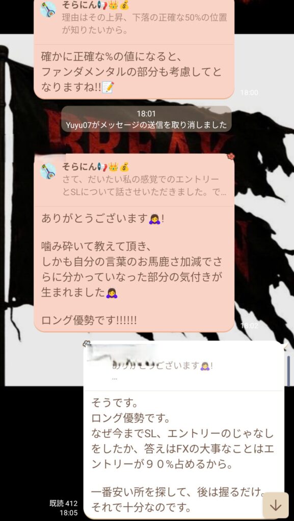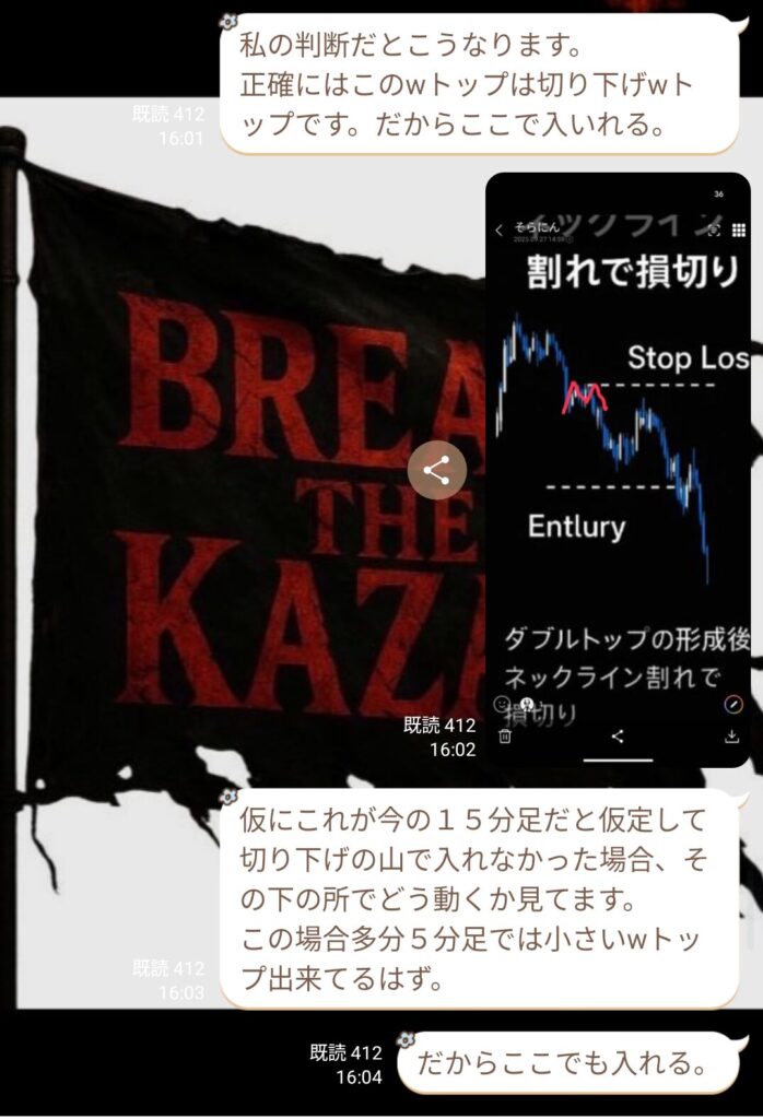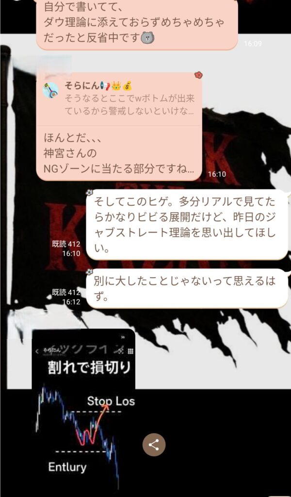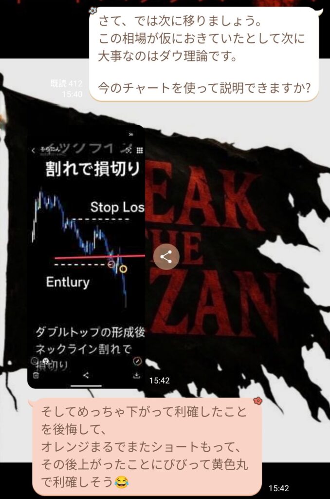 その後、初心者の方から質問が入り、話を聞いていると、ダウ理論をしっかり理解していないことが分かった。ライブで値動きを見ていると逆行が怖くなるのは分かるが、それは根拠の詰め方や情報の使い方が足りていないだけ。経験不足だと感じた。