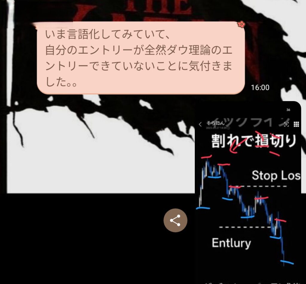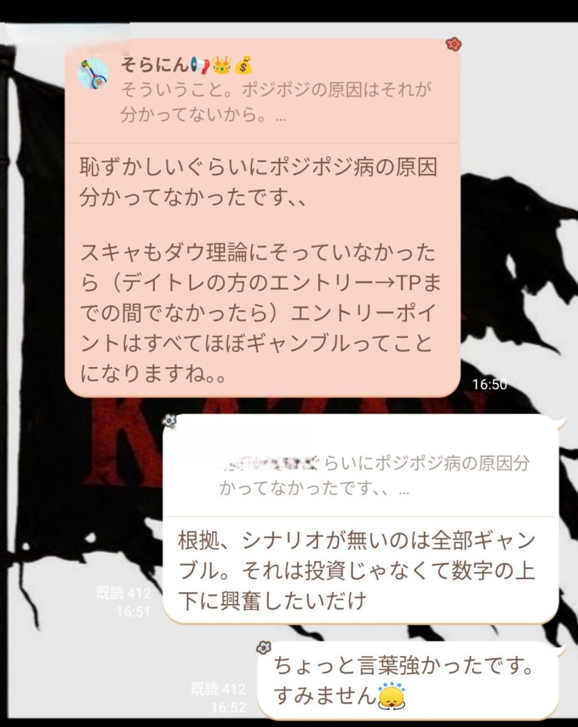 ポジポジ病の原因が分かっていなかったと本人も反省していた。スキャルもダウ理論に沿っていないエントリーは全部ギャンブルだと気づけた。
