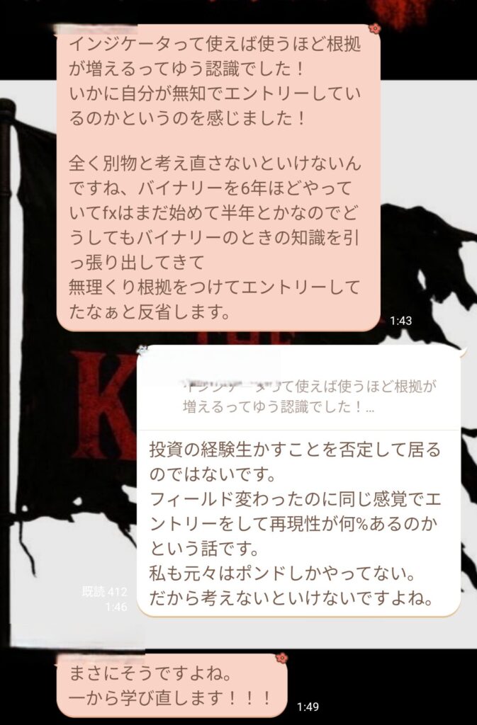 話を聞いていりてメンバーの方は、「インジケーターを使えば使うほど根拠が増えると思っていたけれど、実際は“自分がどれだけ無知なエントリーをしていたか”に気づいた」、という話もありました。