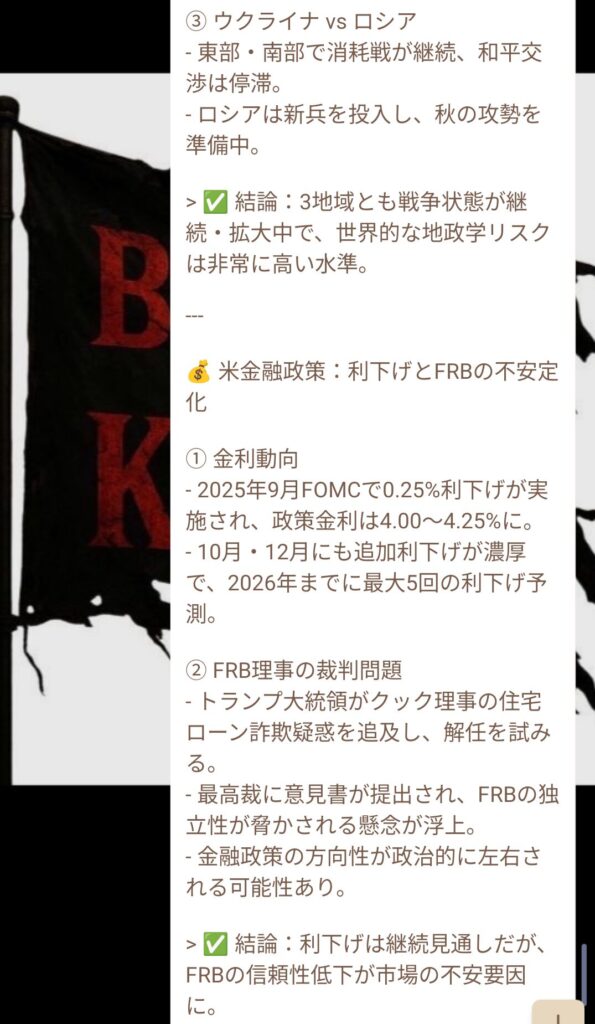 結論として、利下げは継続見込みだが、FRBの信頼低下が市場の不安要因になっていた。