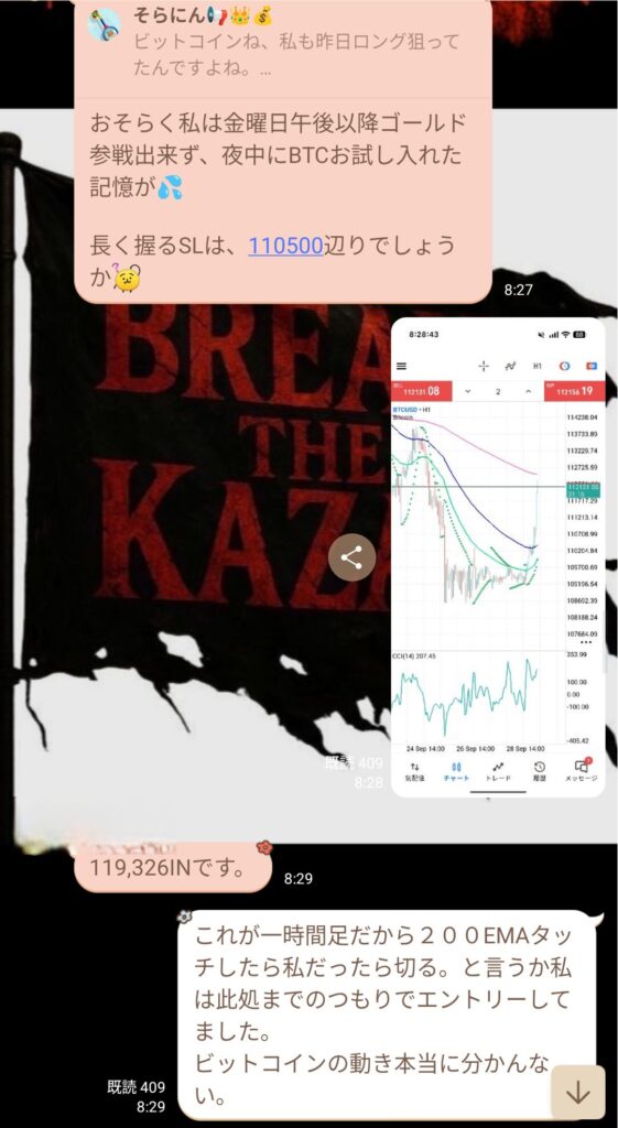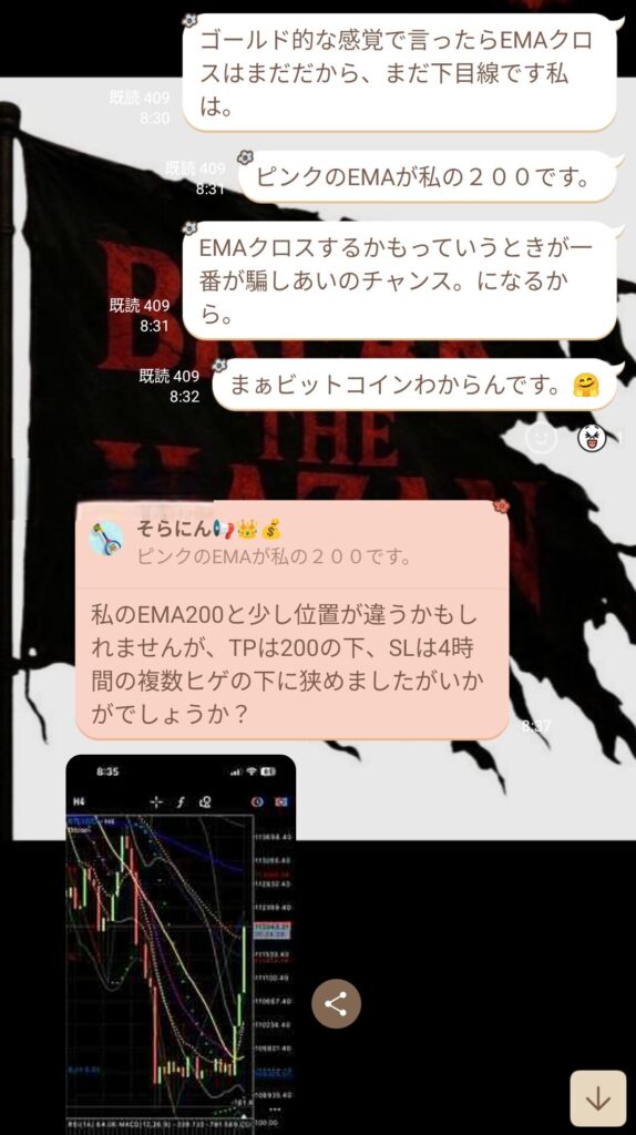 EMAタッチを試みている状況で、ビットコインをトレードしているメンバーと考察を共有できたのはとてもためになった。