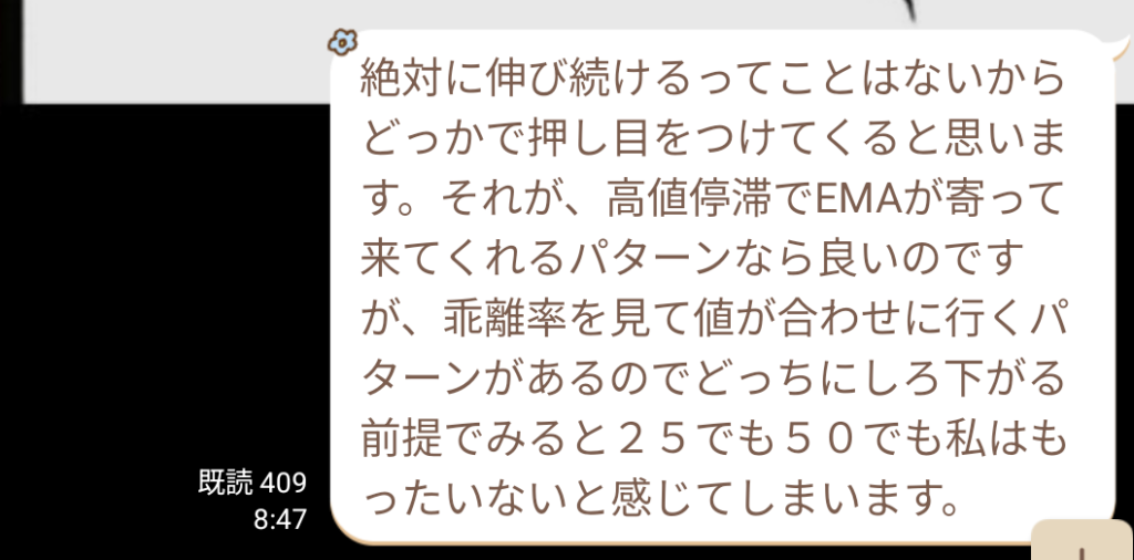 また、高値停滞で価格がEMAが寄ってくるパターンならいいが、乖離を見て値が合わせに行くパターンもある。