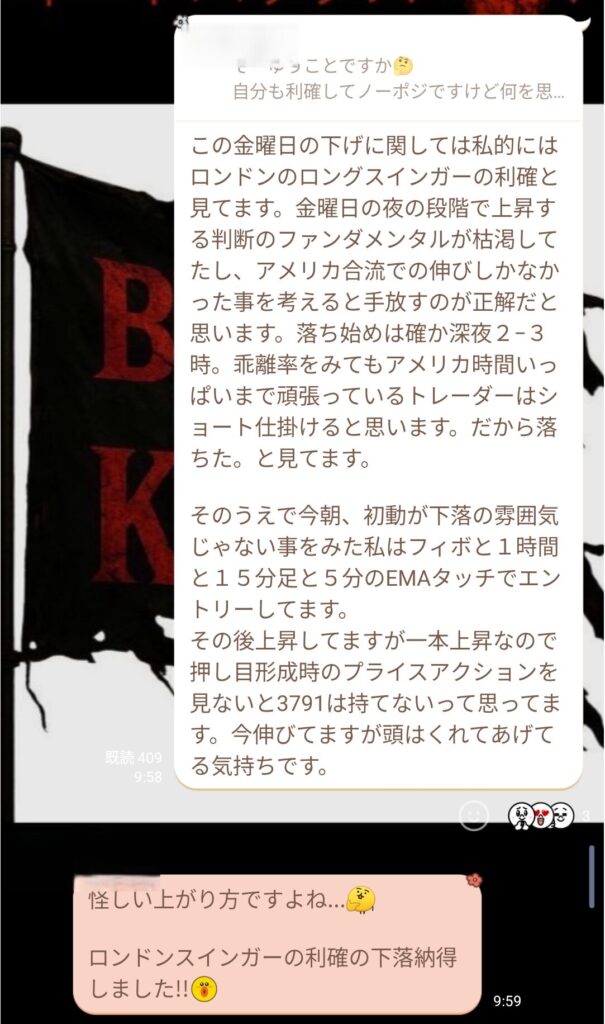 タイミングが合わなかったメンバーには、 「タイミングはシナリオを作れるようになれば身につく」 「勝ちの感覚の方が大事」 とアドバイスして、この日のトレードは終わった。