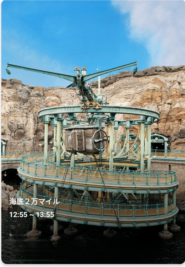 海底二万マイルは、東京ディズニーシーの開業当初からあるクラシックなアトラクションで、ネモ船長の潜水艇に乗り込み、海底探検へ出発するという物語型ライド。 暗い海の中を進む演出や、未知の生物との遭遇など、ディズニーシーらしい“冒険の世界観”をしっかり味わえるのが魅力です。